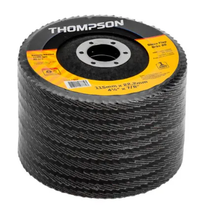 Os discos flap Thompson, permite atividades de desbaste e acabamento ao mesmo tempo, eliminando a troca de discos. Proporciona menor vibração e ruído comparado com o disco de desbaste convencional. Seu formato cônico permite um melhor aproveitamento do disco aumentando o rendimento. Indicado para uso em esmerilhadeiras.
