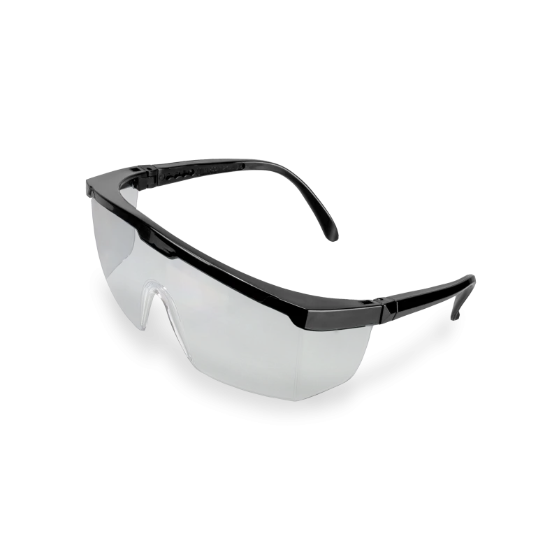Óculos de proteção, constituídos de arco de material plástico (nylon) com meia-proteção nas bordas, um pino central al?nete e duas fendas nas extremidades da armação utilizadas para o encaixar de visor confeccionado em policarbonato com um furo central para encaixe do pino do arco, apoio nasal e protetor lateral injetado no mesmo material do visor com uma fenda em cada extremidade para o encaixe no arco, hastes do tipo espátula confeccionado do mesmo material que o arco e constituídas de duas peças: semi-haste vazada com uma extremidades presas ao arco por meio de parafuso metálico e outra semi-haste vazada que se encaixa na semi-haste anterior e permite regulagem de tamanho.