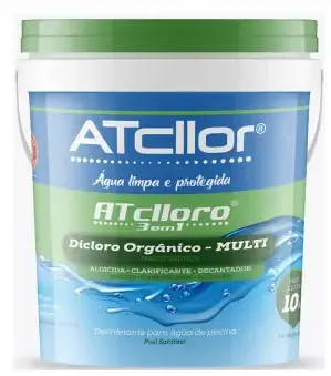 Dicloro para tratamento de agua de piscina, possui 3 funcoes em 1 produto: desinfeta,clarifica e decanta atingindo o res ultado desejado de forma pratica. teor ativo 36,47 por cento