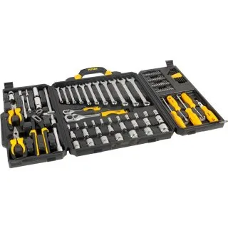 1 Jogo de ferramentas, composto por 110 peças, sendo: 1 maleta plástica, 1 porta-chaves allen/hexagonais, 4 porta-bits, 1 alicate corte diagonal 6" em aço cromo vanádio, 1 alicate de bico meia-cana 6" em aço cromo vanádio, 1 alicate bomba d'água 10" em aço cromo vanádio, 2 chaves de fenda em aço cromo vanádio (5,0 mm x 75 mm (3/16" x 3") e 6,3 mm x 100 mm (1/4" x 4")), 2 chaves phillips em aço cromo vanádio (5,0 mm x 75 mm (n°1 - 3/16" x 3") e 6,3 mm x 100 mm (n°2 - 1/4" x 4")), 8 chaves allen/hexagonais em aço cromo vanádio (1,5 mm, 2 mm, 2,5 mm, 3 mm, 4 mm, 5 mm, 5,5 mm e 6 mm), 11 chaves combinadas em aço cromo vanádio (8 mm, 9 mm, 10 mm, 11 mm, 12 mm, 13 mm, 14 mm, 15 mm, 17 mm, 18 mm e 19 mm), 15 soquetes sextavados encaixe 1/2" em aço cromo vanádio (10 mm, 11 mm, 12 mm, 13 mm, 14 mm, 15 mm, 17 mm, 18 mm, 19 mm, 20 mm, 21 mm, 22 mm, 23 mm, 24 mm e 27 mm), 1 catraca encaixe 1/2" em aço ao cromo, 1 extensão 5" em aço cromo vanádio encaixe 1/2", 1 junta universal em aço cromo vanádio encaixe 1/2", 1 cabo T em aço cromo vanádio encaixe 1/2" x 10", 2 soquetes para vela de ignição em aço cromo vanádio (16 mm e 21 mm), 11 soquetes sextavados em aço cromo vanádio encaixe 1/4" (4 mm, 5 mm, 6 mm, 7 mm, 8 mm, 9 mm, 10 mm, 11 mm, 12 mm, 13 mm e 14 mm), 1 catraca encaixe 1/4" em aço ao cromo, 1 extensão em aço cromo vanádio 2" encaixe 1/4", 1 extensão em aço cromo vanádio 4" encaixe 1/4", 1 extensão flexível 6" em aço cromo vanádio encaixe 1/4", 1 junta universal em aço cromo vanádio encaixe 1/4", 1 cabo adaptador para bits com catraca em aço cromo vanádio encaixe 1/4", bits magnéticos em aço cromo vanádio encaixe 1/4": 7 fenda (3,5 mm (2 peças), 4 mm (2 peças), 5,5 mm, 6,5 mm e 8 mm), 8 phillips (n° 0, n° 1, n° 2 e n° 3 (2 peças cada)), 6 allen (2 mm, 3 mm, 4 mm, 5 mm, 6 mm e 7 mm), 3 quadrados (S1, S2 e S3), 7 hexalobular (T10, T15, T20, T25, T27, T30 e T40), 3 pozidrive (PZ1, PZ2 e PZ3), 4 três pontas (1, 2, 3 e 4) e 2 adaptadores.