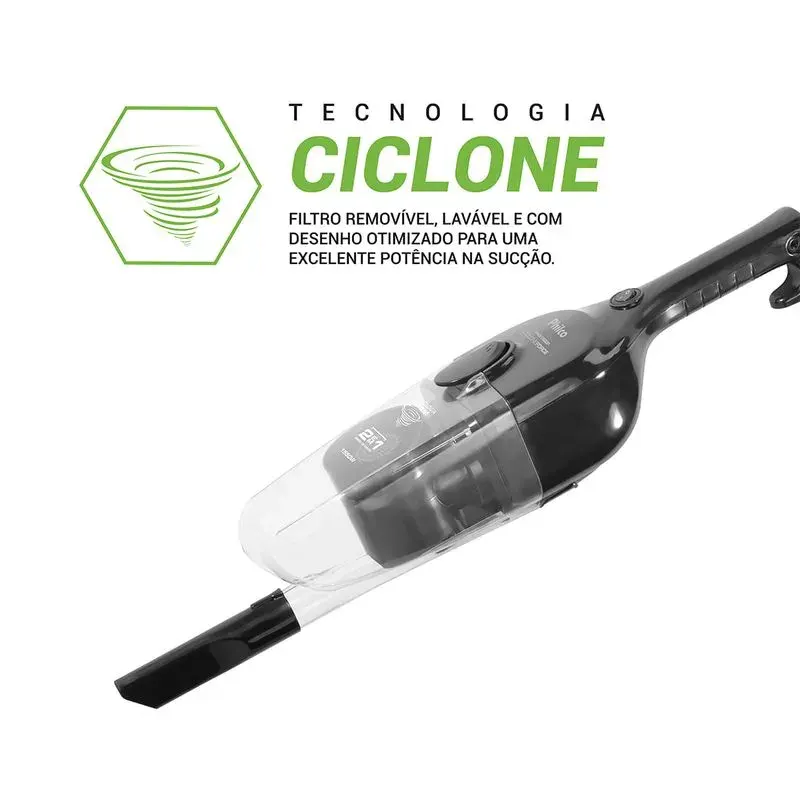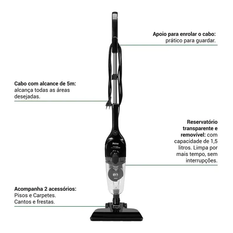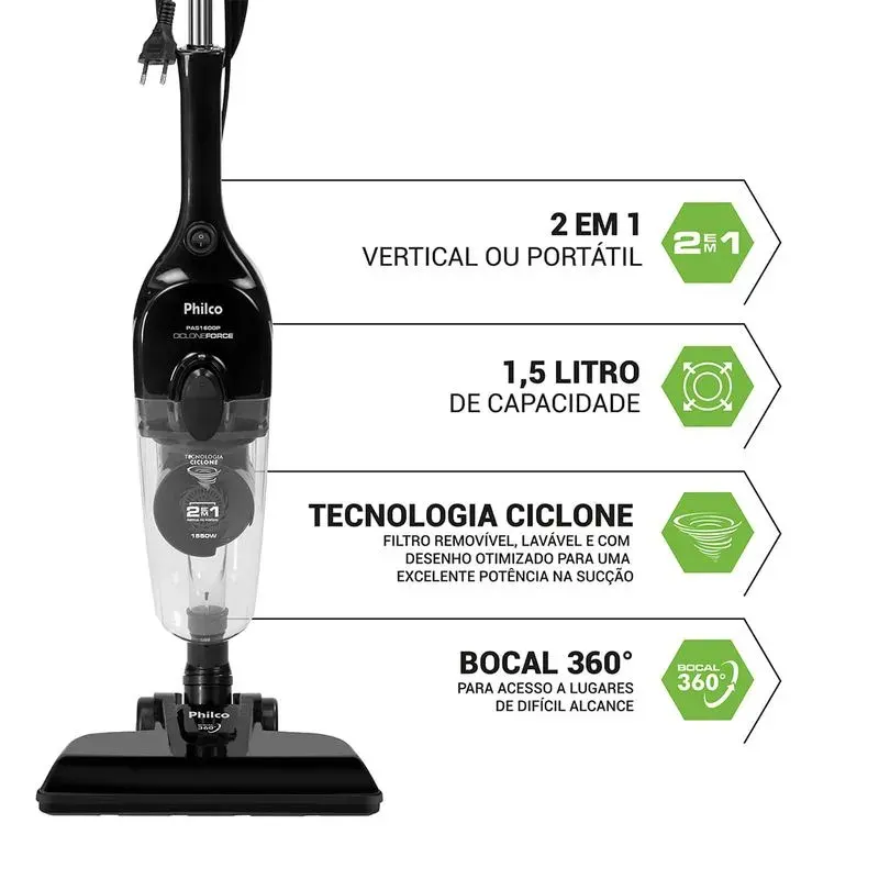 Potência e praticidade para manter sua casa sempre limpinha é com o Aspirador de Pó Vertical Philco PAS1600P. Seus 1450W de potência, aliados à versatilidade de ser 2 em 1, fazem dele um produto eficiente e indispensável para a sua rotina de limpeza. Além de poder ser utilizado de maneira portátil ou vertical, o PAS1600P possui base com rotação total de 360° que ajuda a alcançar os lugares mais difíceis com maior facilidade. Seu cordão com alcance de 5 metros também permite maior mobilidade durante o uso, evitando as constantes trocas de tomadas. O Aspirador de Pó Vertical da Philco conta com o incrível filtro Ciclone, removível, lavável e com desenho otimizado para uma excelente potência de sucção, não deixando rastros de sujeira para trás. Compacto e desmontável, acompanha acessórios para pisos, carpetes, cantos e frestas, facilitando a hora da limpeza. Também possui reservatório transparente com capacidade de 1,5L, que permite visualizar se o coletor de pó está cheio, além de garantir mais autonomia nas atividades de limpeza. Sua casa sempre limpa de forma rápida e eficiente com o Aspirador de Pó PAS1600P da Philco. Aspirador 2 em 1 Design moderno e compacto Fácil de manusear e carregar Compartimento de pó transparente com 1,5L Cordão elétrico 5,0m Com acessórios de sucção para limpeza de pisos, tapetes, carpetes e estofados Com acessório para cantos, frestas e estofados Com suporte de acessórios Pode ser usado sem a haste, como portátil Porta cordão Composição: Plástico e metal.