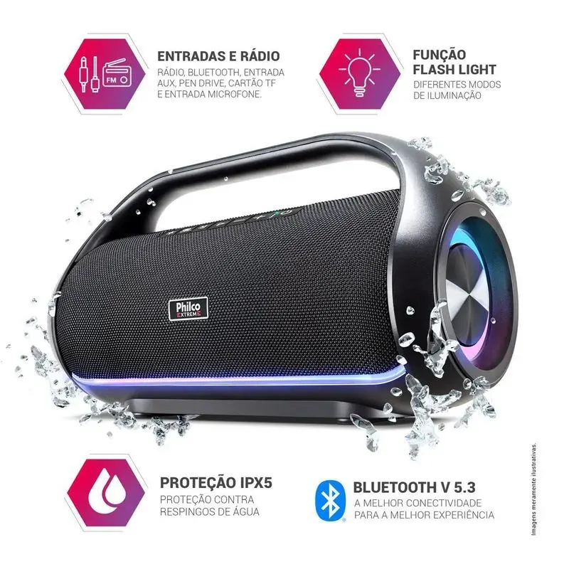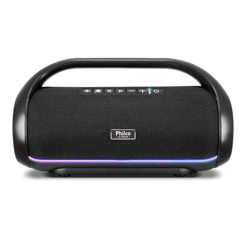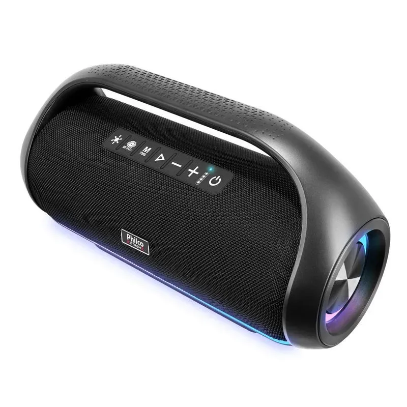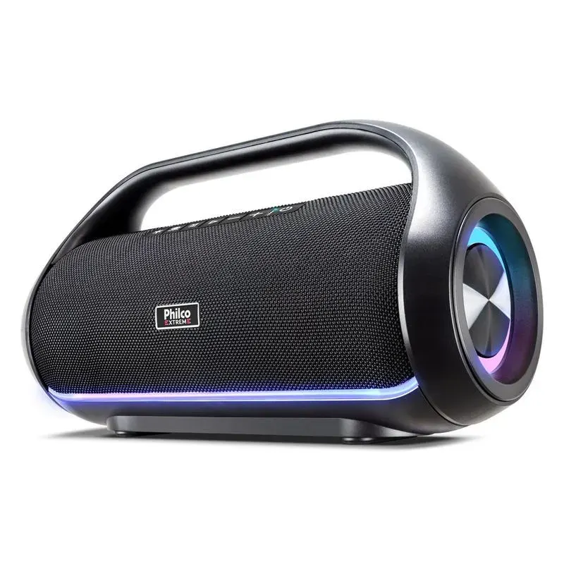Deixe suas comemorações mais animadas e festivas com a Caixa de Som Speaker Philco Extreme 220W PBS220BT. São até 14 horas de duração da bateria interna e ela ainda é recarregável. Aliado a essa vantagem, o speaker é bivolt, portátil e possui alça para facilitar o transporte. Com isso, você pode leva-la para onde quiser, a qualquer hora. A Caixa de Som Speaker PBS220BT possui diversos tipos de entradas e acesso via Bluetooth, o que aumenta a conectividade do aparelho com demais dispositivos. Desse modo, mais os 220W de potência, a diversão é garantida. Todas essas vantagens são acompanhadas pela Função Flash Lights, que permite a mudança das cores exibidas pelo Speaker, enquanto você escuta suas músicas preferidas. Aproveite de todos os benefícios que o Speaker Philco PBS220BT Extreme Bluetooth 220W pode te trazer e eleve a qualidade performance do som aos escutar seus áudios no ambiente. Potência 220W RMS Bluetooth 5.3 2 woofers 3,5 polegadas Flash light Bateria interna de Li-ion, 3,7V 4500mAh Rádio FM Memória para gravar estações de rádio USB: Entrada USB para reprodução de músicas Entrada auxiliar de áudio /AUX IN (P2) Entrada para cartão de memória TF até 64Gb Entrada para microfone; • Entrada USB-C para carregamento Função TWS LED indicador de carga de bateria LED indicador de conexão Bluetooth Função EX Bass Proteção IPX 5.
