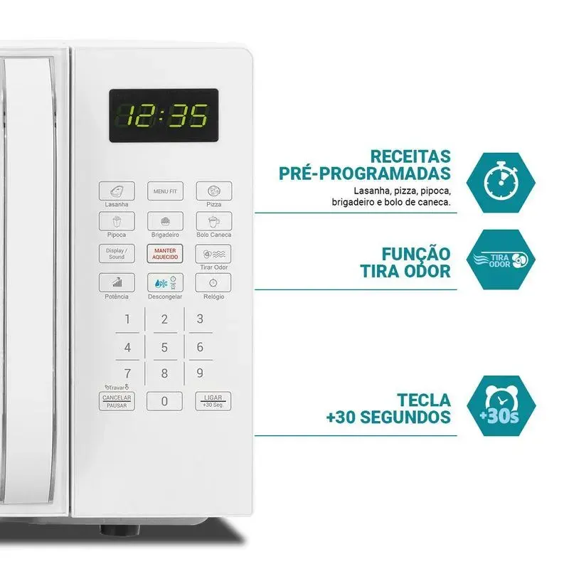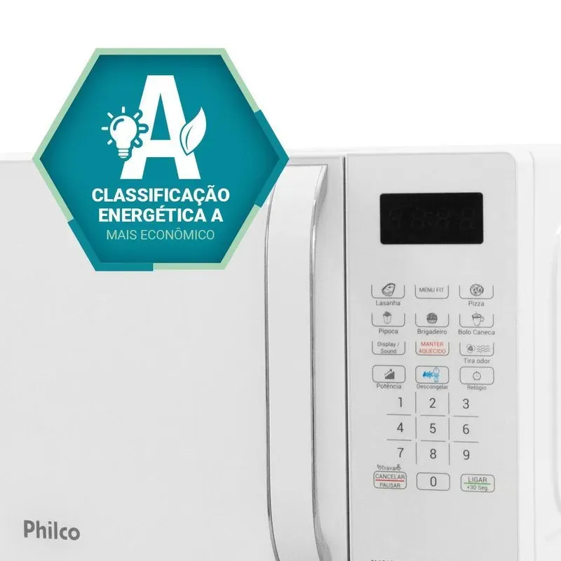O Micro-Ondas 20L Philco PMO23B tem pintura Limpa Fácil especial que não permite que a sujeira grude nas paredes internas do micro-ondas, facilitandoa limpeza. A tecla Tira Odor do Micro-ondas é excelente para remoção de cheiro deixado pelo preparo de alimentos no interior do aparelho. Também tem a Função descongelar para descongelar por tempo ou por peso, e a Função travar que bloqueia o teclado, evitando acidentes. Já a Função display permite apagar o display do produto, enquanto a Função Display/Sound desliga o visor e o som do teclado desligará. E para aqueles que não abrem mão de facilidade na correria do dia dia, o Menu FIT permite cozinhar batata, sopa e legumes e pouco tempo. Micro-Ondas 20L Philco PMO23B para uma rotina descomplicada na cozinha ! Capacidade 20L Prato com diâmetro de 250mm Teclas fáceis: FIT e Manter Aquecido Opções Descongelar Rápido ou Descongelar por Peso Função Potência Função Relógio Função Display / Sound Função Tira odor 1100W de potência Classe "A" em eficiência energética.